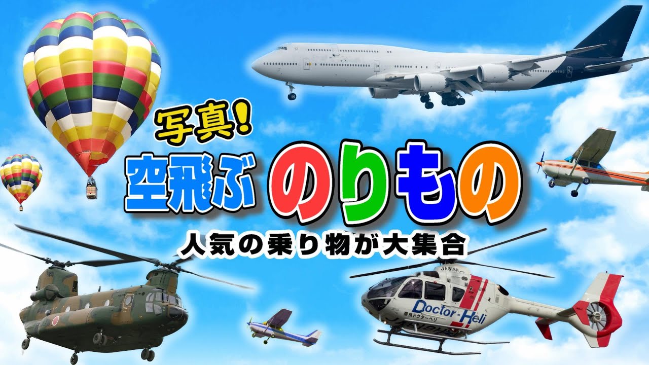 子供向けアニメ はたらくくるま、空飛ぶいろんな乗り物!名前と写真 飛行機、ヘリコプター、ドクターヘリ、気球、セスナ、大量輸送ヘリコプターVehicles日本語 ひらがな。