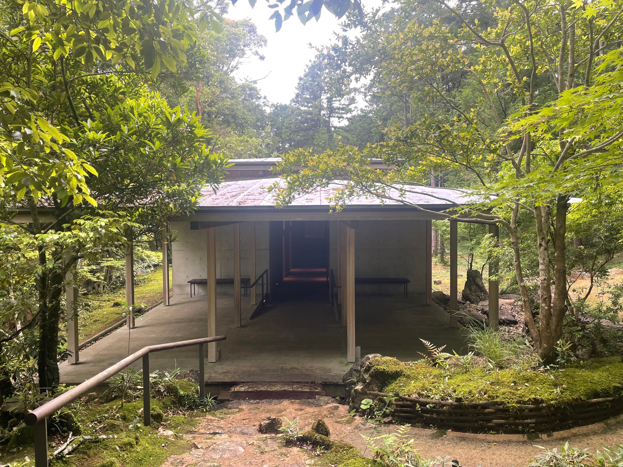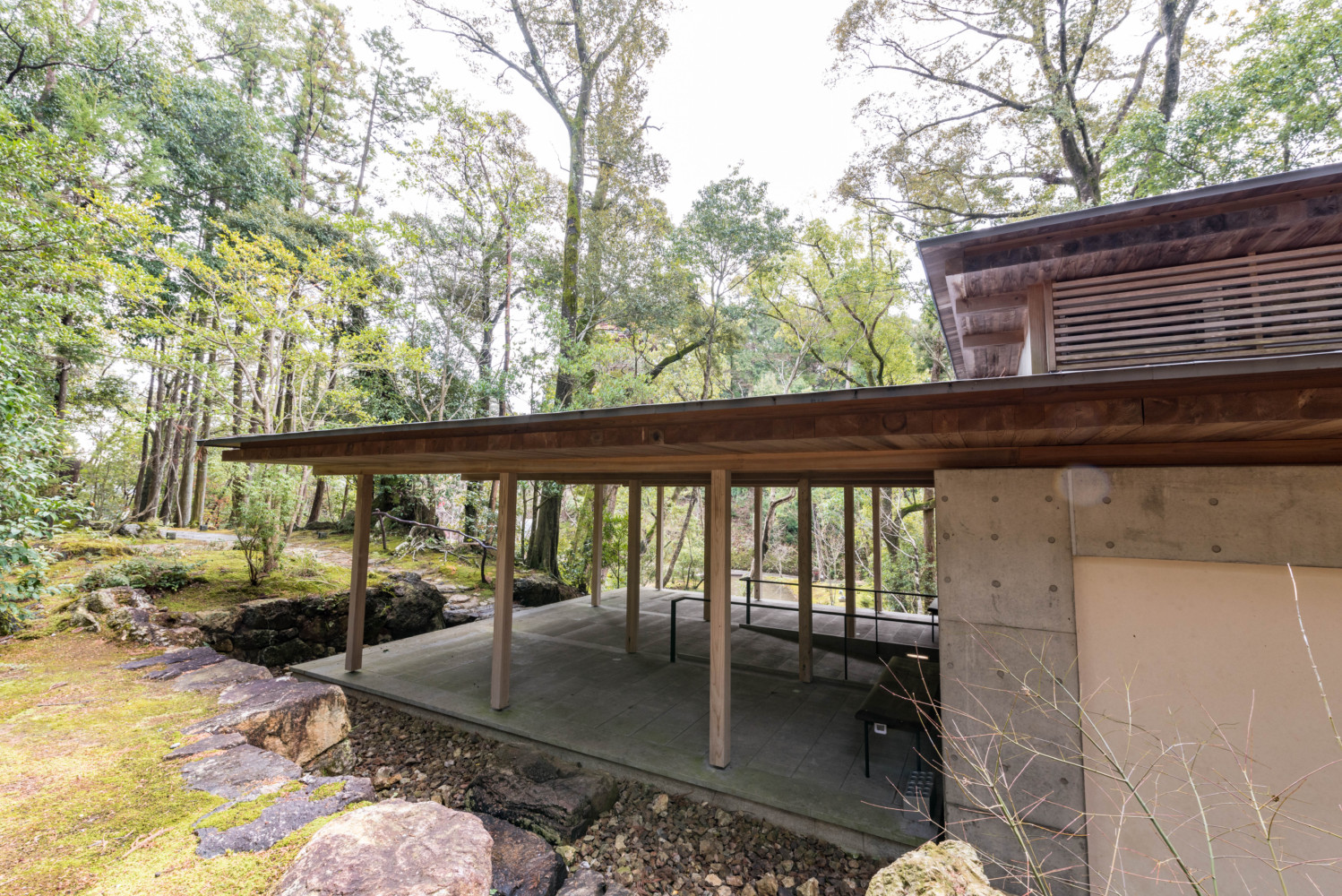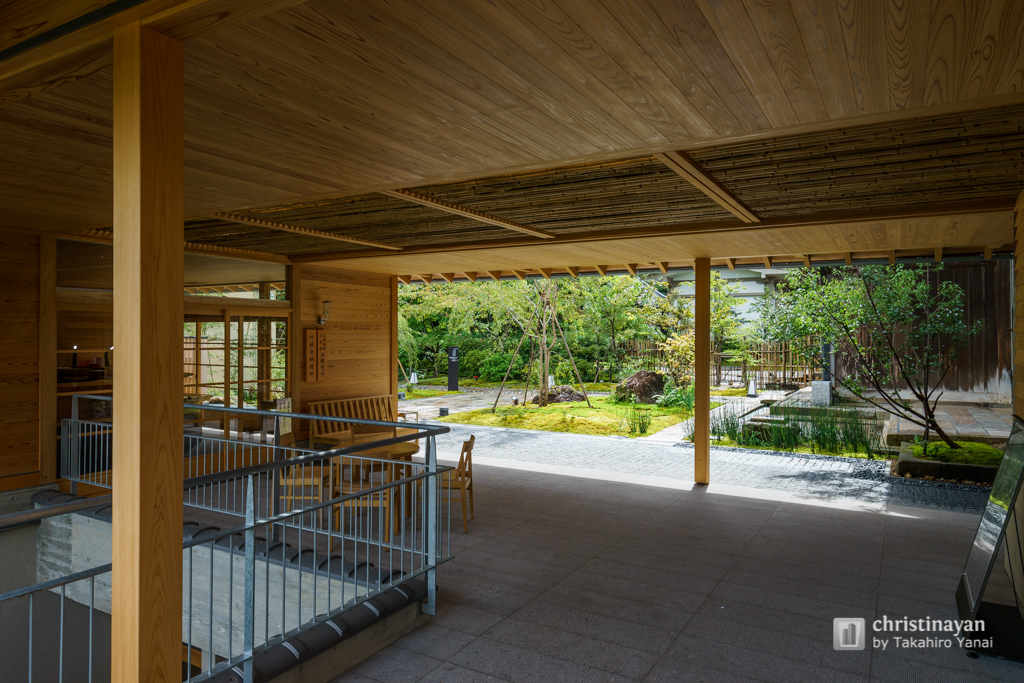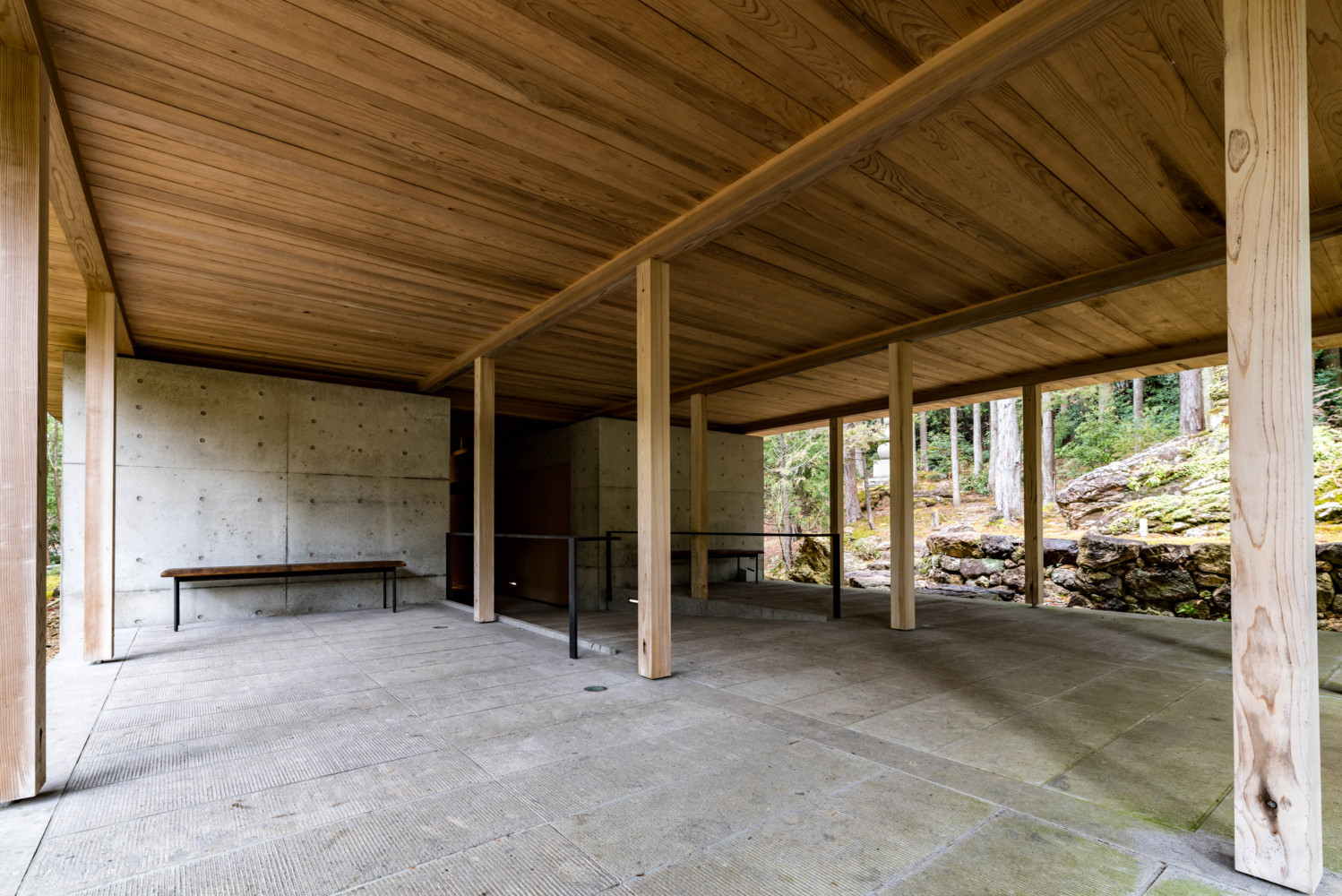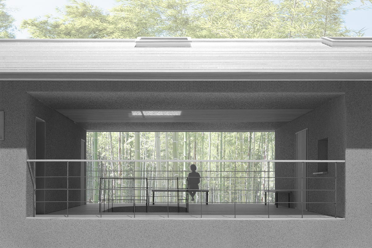 竹林寺納骨堂の低い屋根がかかる半外部空間冨田秀雄建築アトリエ。