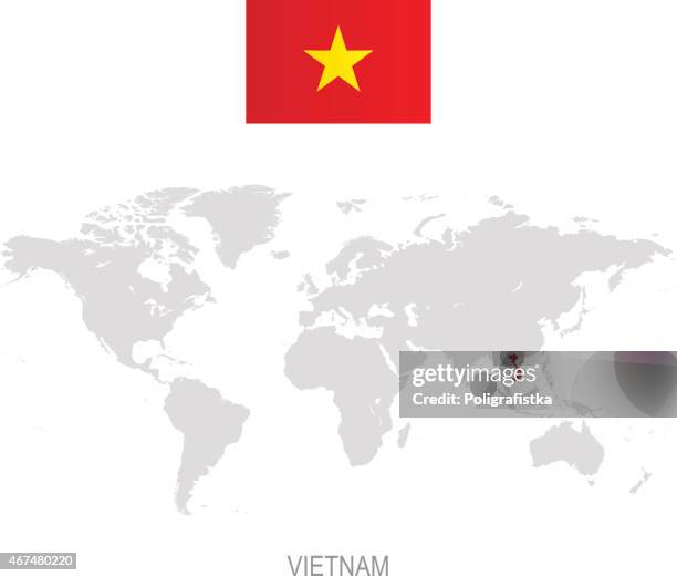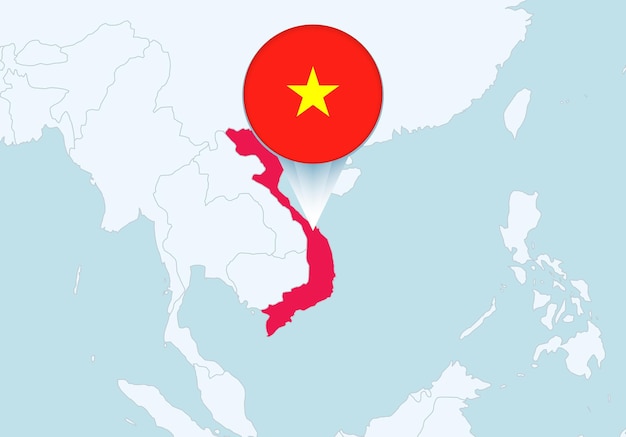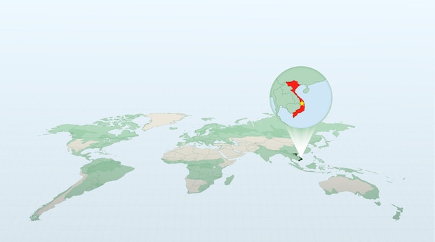 世界地図上のベトナムの位置はベトナム国旗のピンでマークされていますPremiumベクトル素材。