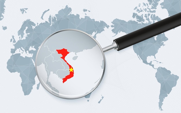 ベトナムの拡大鏡でアジアを中心とした世界地図 太平洋中心の世界地図上のベトナムの地図に焦点を当てるPremiumベクトル素材。