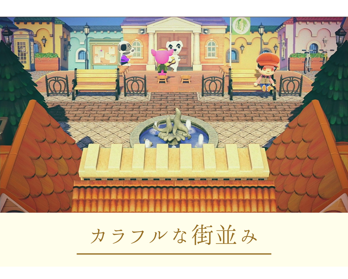 あつ森 街並みに馴染んだ案内所前の広場とカフェ 島クリ。