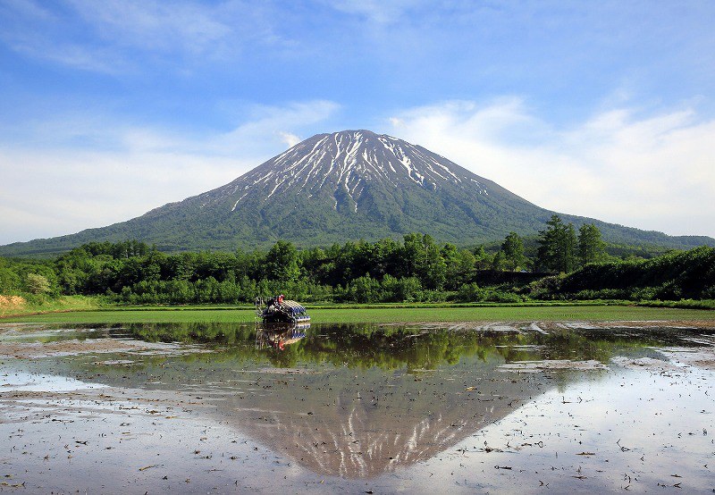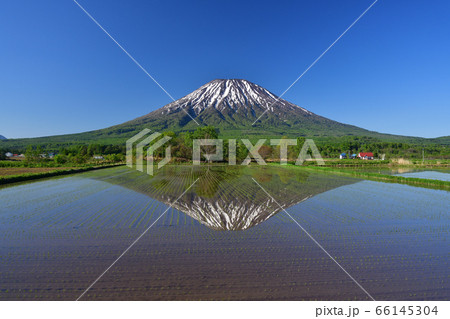 初夏の北海道倶知安町で残雪の羊蹄山と水田に映る逆さ羊蹄山の朝の風景の写真素材66145304- PIXTA。