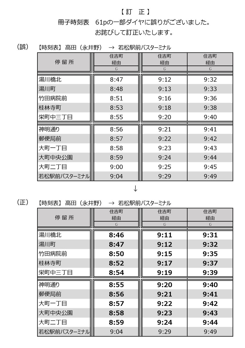 2020年10月1日改正 時刻表の訂正について - お知らせ -。