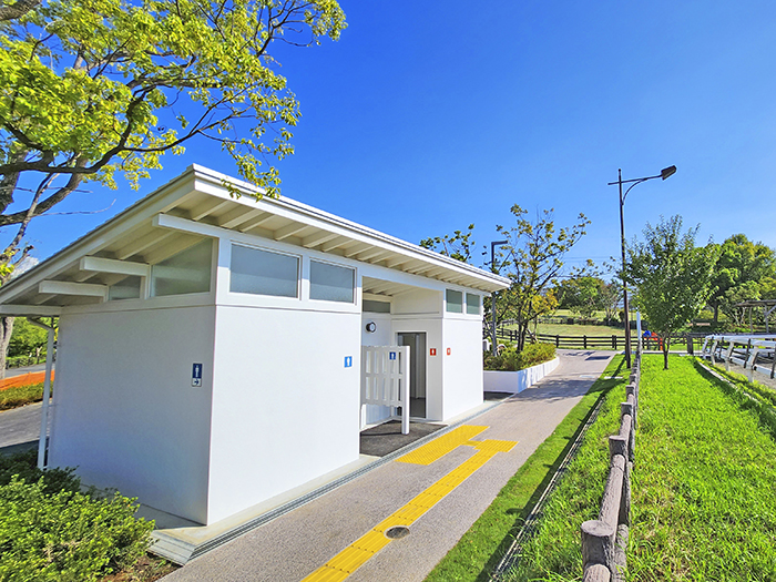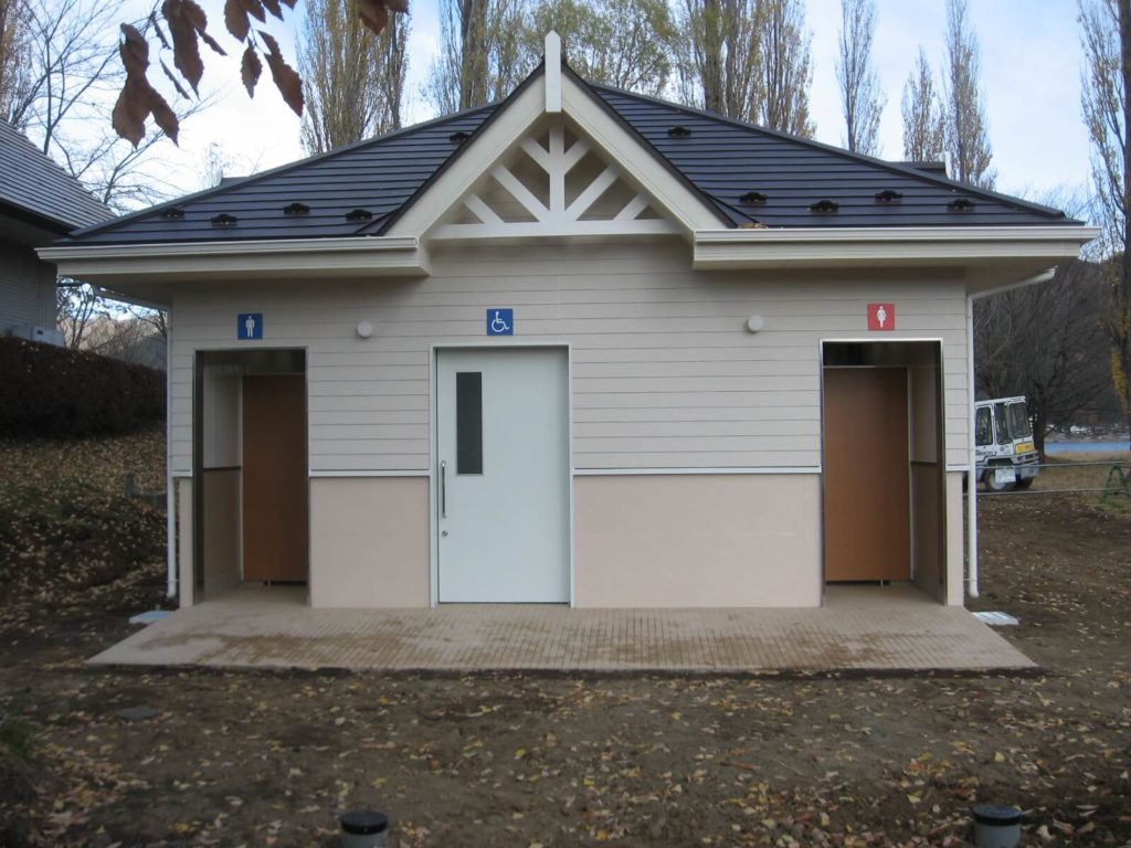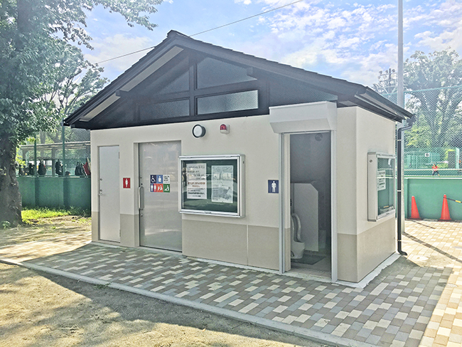 公園、河川敷などの公衆トイレ、仮設トイレ、屋外トイレ、簡易トイレユニットは三晃商事株式会社。
