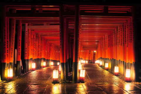 伏見稲荷大社夜でもライトアップされている千本鳥居京都- かべごえ旅行絵巻。