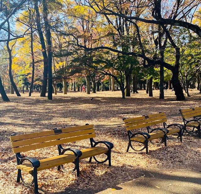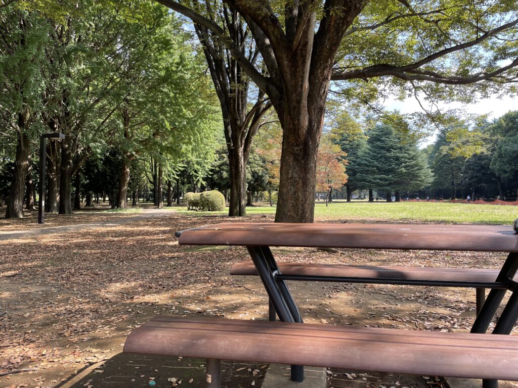 Autumn ~🍂 机のあるベンチは空いてる確率0.0001% 紅葉スポット代々木公園おしゃピク 淡色女子淡色カフェ秋コーデ。