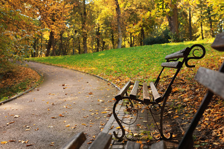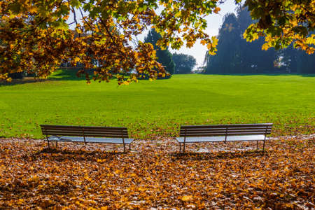 代々木公園の空の公園のベンチは、イッコの紅葉の下にあります。の写真素材・画像素材 Image 92870380。
