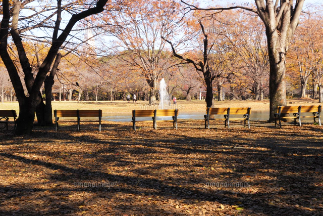 紅葉の代々木公園の休憩所のベンチ 10168005350 の写真・イラスト素材アマナイメージズ。