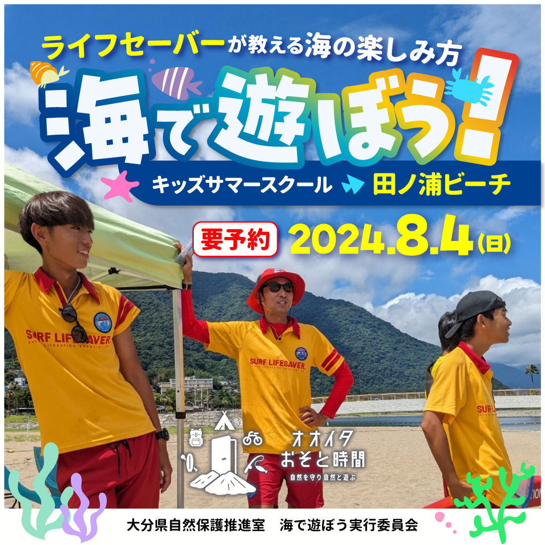 オオイタおそと時間イベント 「海で遊ぼう! ライフセーバーが教える海の楽しみ方!」キッズサマースクール in 田ノ浦ビーチ。