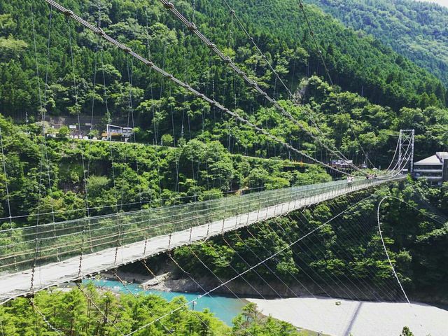 本日ご紹介するのは、谷瀬の吊り橋です! 長さ297m、高さ54mの、生活用としては日本一長い吊り橋で、歩くたびに揺れる吊り橋はスリル満点😱 吊り橋を渡るには勇気が必要そうです!渓谷に沿って連なる山脈や橋下を流れる美しい川は、ここでしか観られない十津川の絶景です。