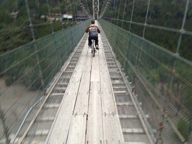奈良県吉野郡十津川村の「谷瀬の吊り橋」は生活用としては日本一長い吊り橋だそうです。 長さ297m、高さ54m。 みんな怖がって途中で引き返してたよ🙄吊り橋。