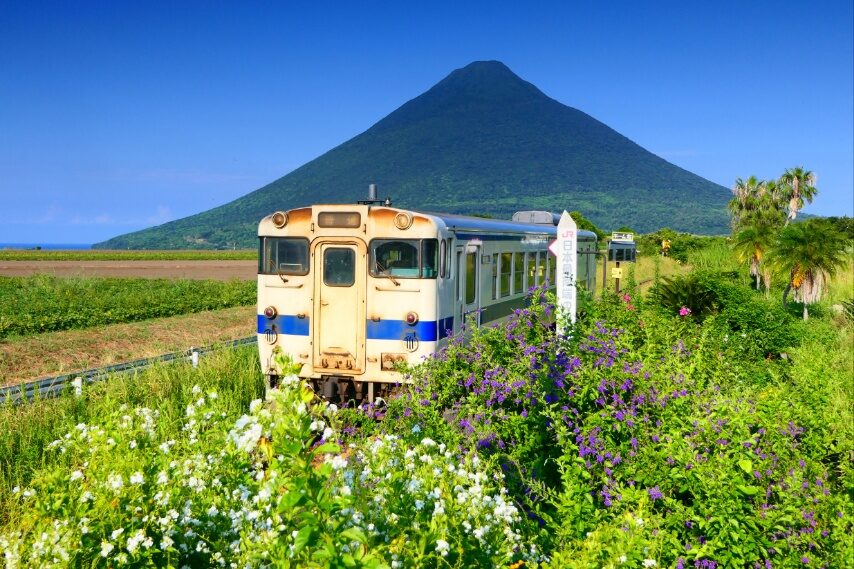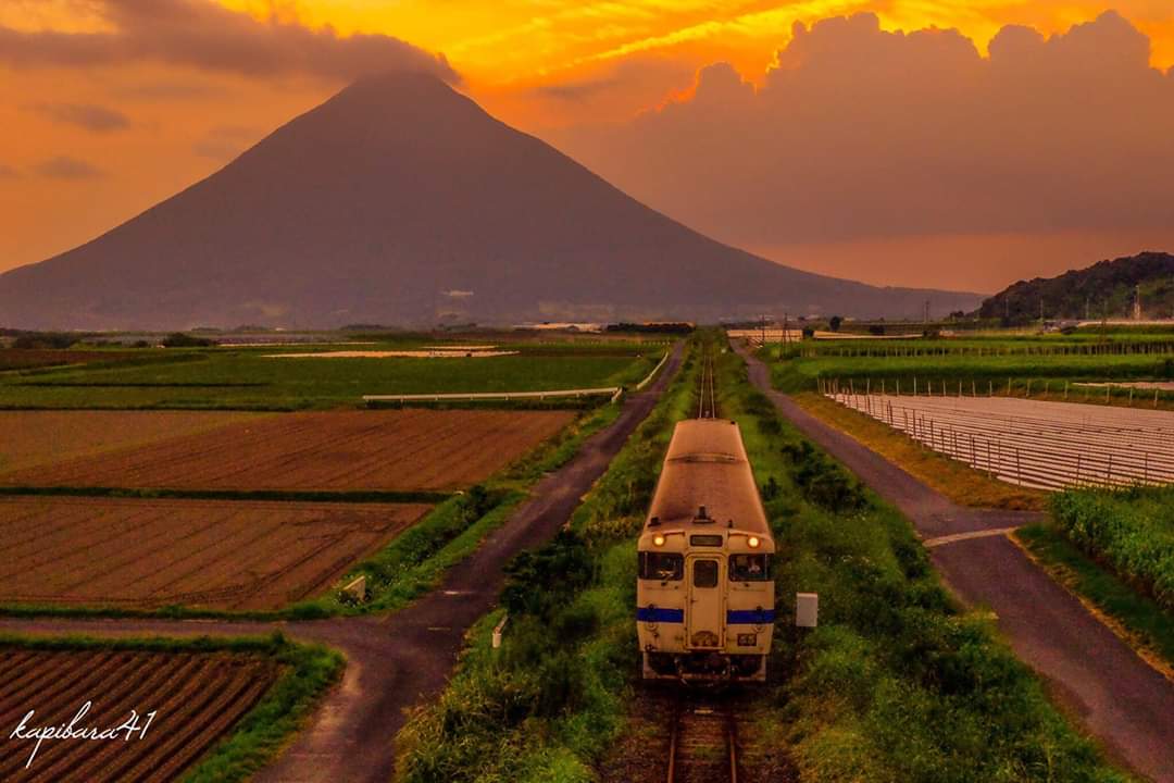 ダイヤモンド開聞岳と指宿枕崎線 SUNSET TRAIN☀️ 青春18きっぷのポスター撮影地として知られる場所。。