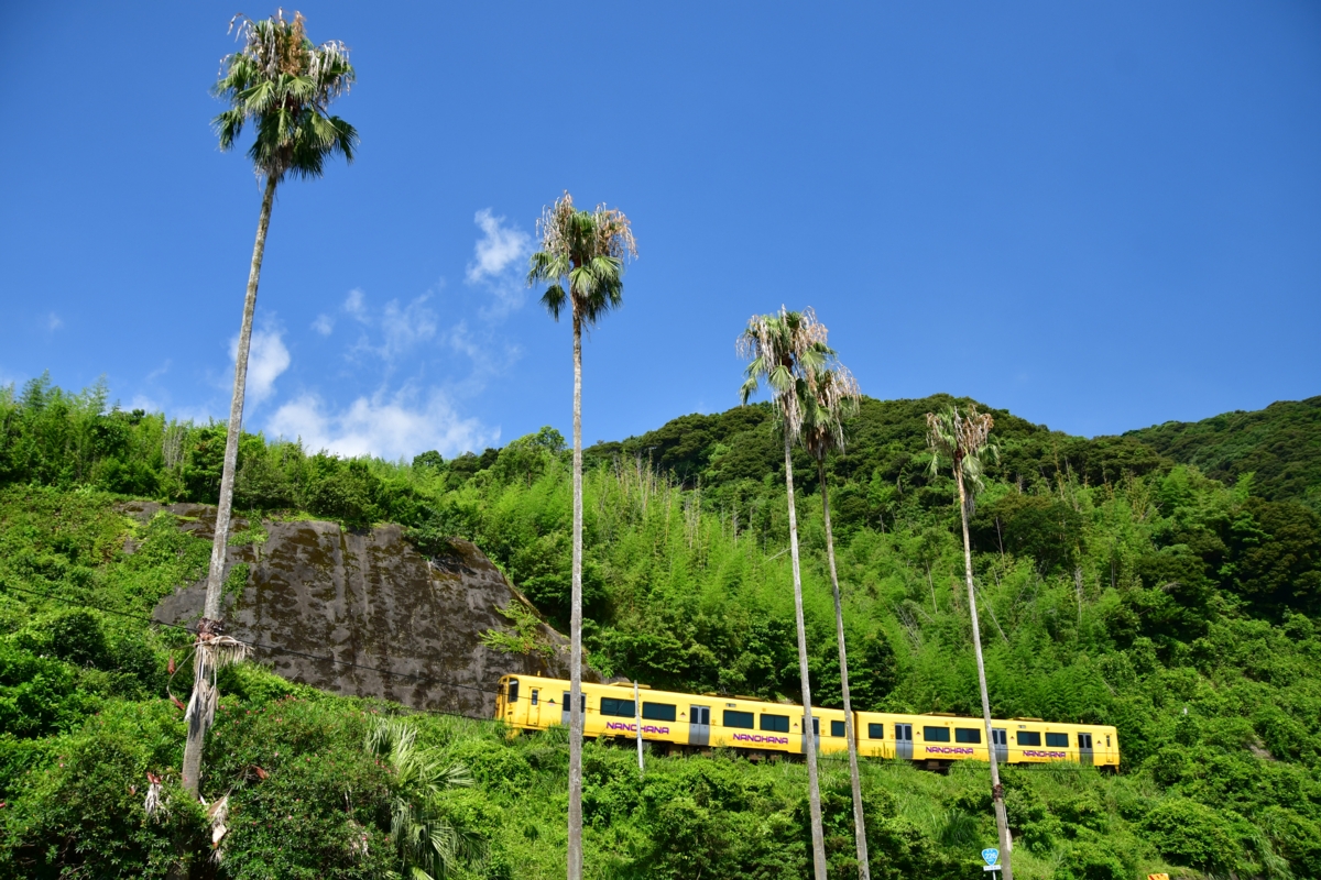 指宿枕崎線 夏の風景 – 山の見える駅いろどりの鉄道風景。