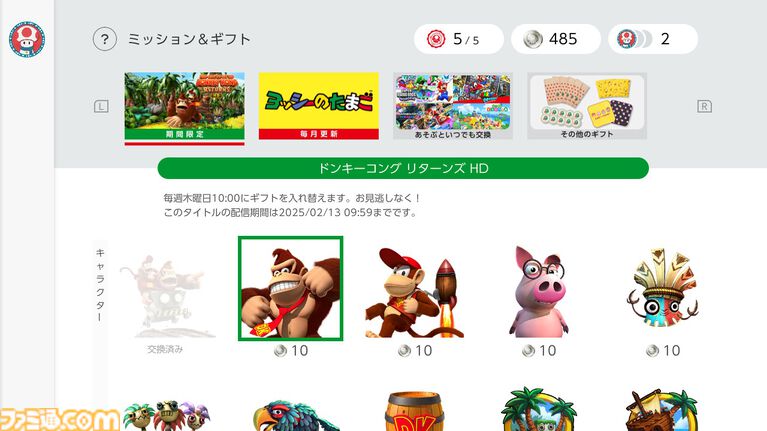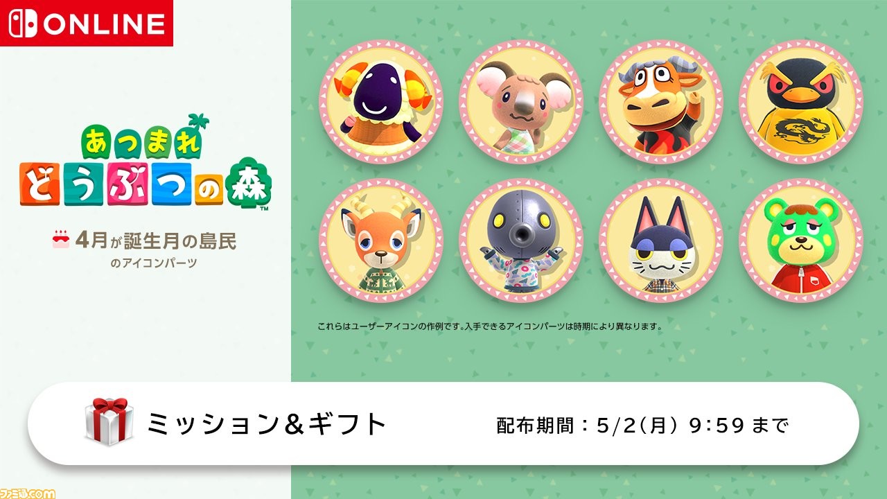 好きなキャラクターでユーザーアイコンをカスタマイズ。本日より「Nintendo SwitchOnline」加入者向けに「ミッション&ギフト」がスタート。トピックスNintendo。
