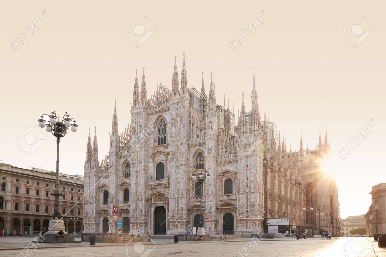 黄金の太陽の光が、壮大なミラノのドゥオーモまたはミラノ大聖堂の正面に反射しています。イタリア、ミラノ。 2020年8月22日の写真素材・画像素材Image 157554671。