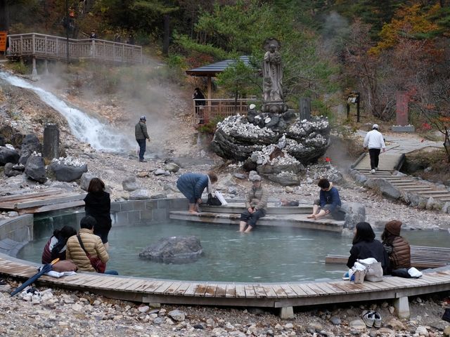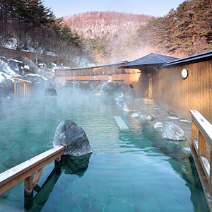 群馬・草津温泉 草津温泉 西の河原露天風呂○日本最大級の露天風呂で広々紅葉露天を満喫。夜は西の河原公園とともにライトアップも。
