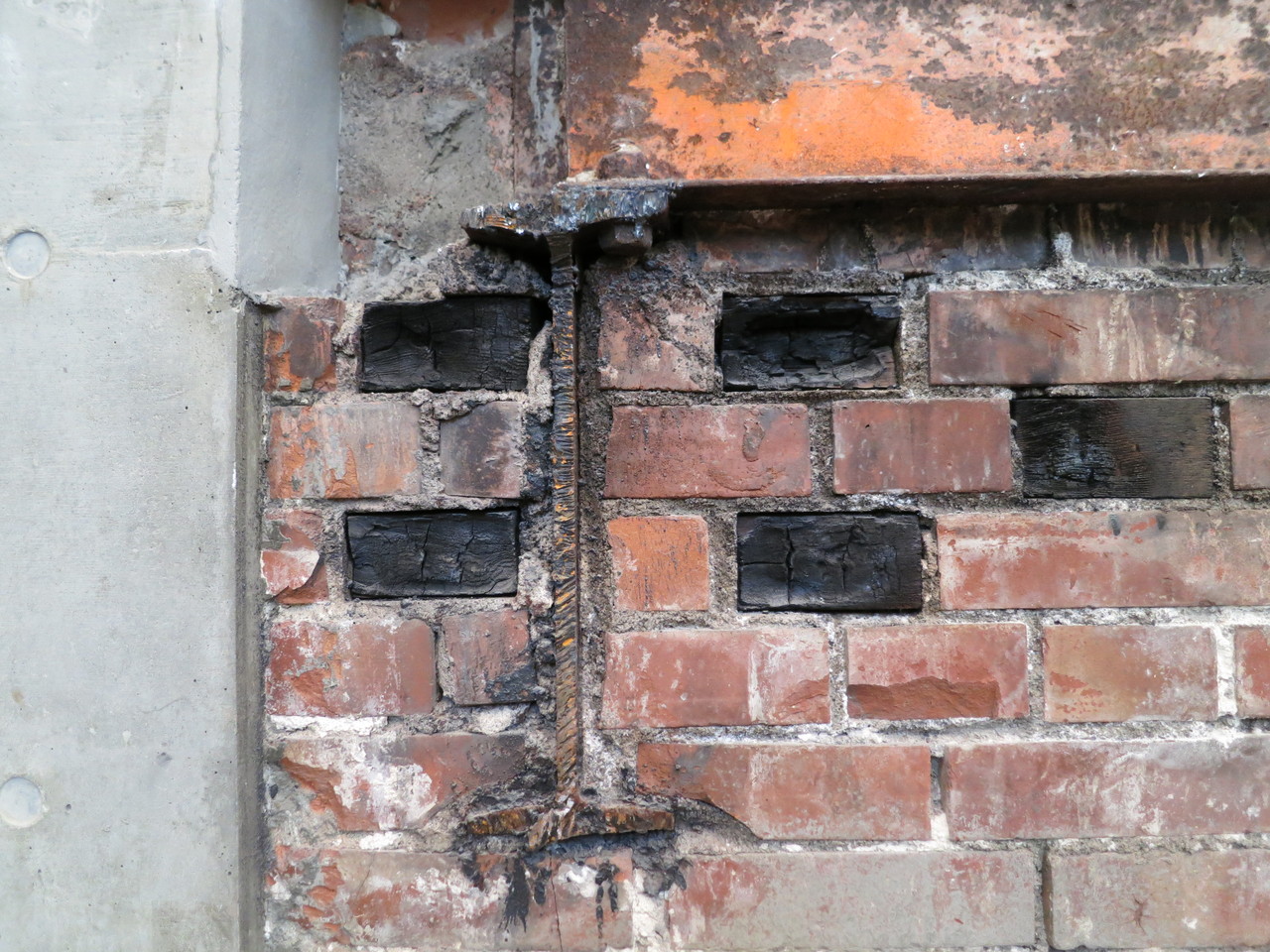 東京駅Tokyo Station- 丸の内駅舎を飾る美しい化粧レンガ。その下では無骨な構造レンガが建物をしっかりと支えています。南ドーム近くのコンコースには、創建当時の構造レンガが展示されています。 The original。