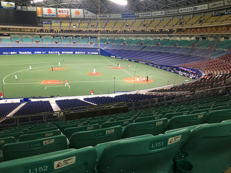 新型コロナウイルスの感染拡大の影響で、無観客で行われた中日―広島のオープン戦=2020年2月29日午後2時37分、名古屋市東区のナゴヤドーム、山本正樹 撮影 15。