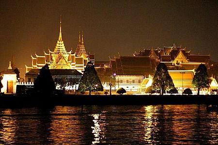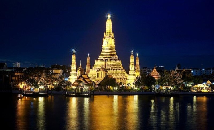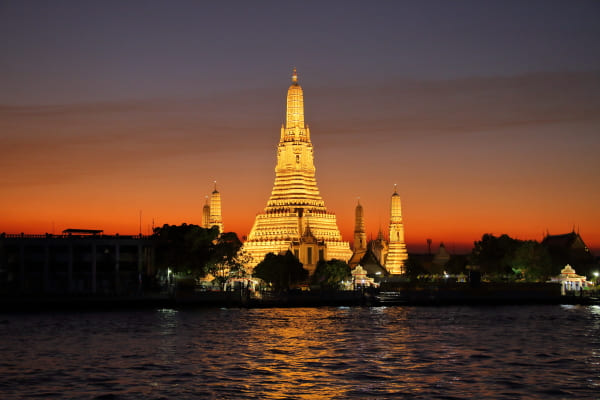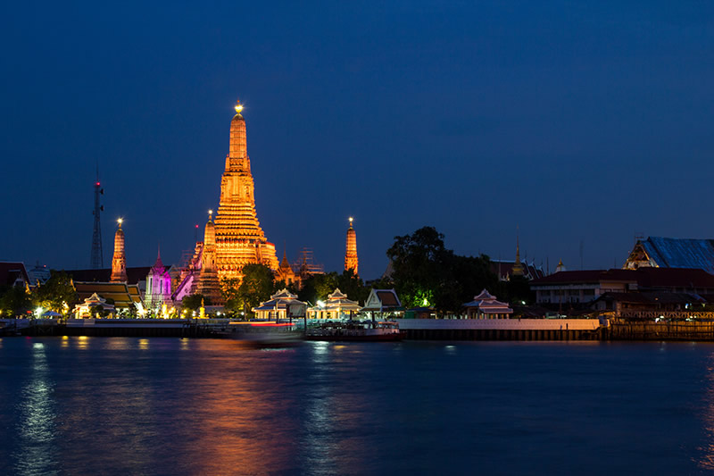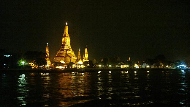 バンコク観光 無料、チャオプラヤー川のワットアルン夜景ライトアップ -。