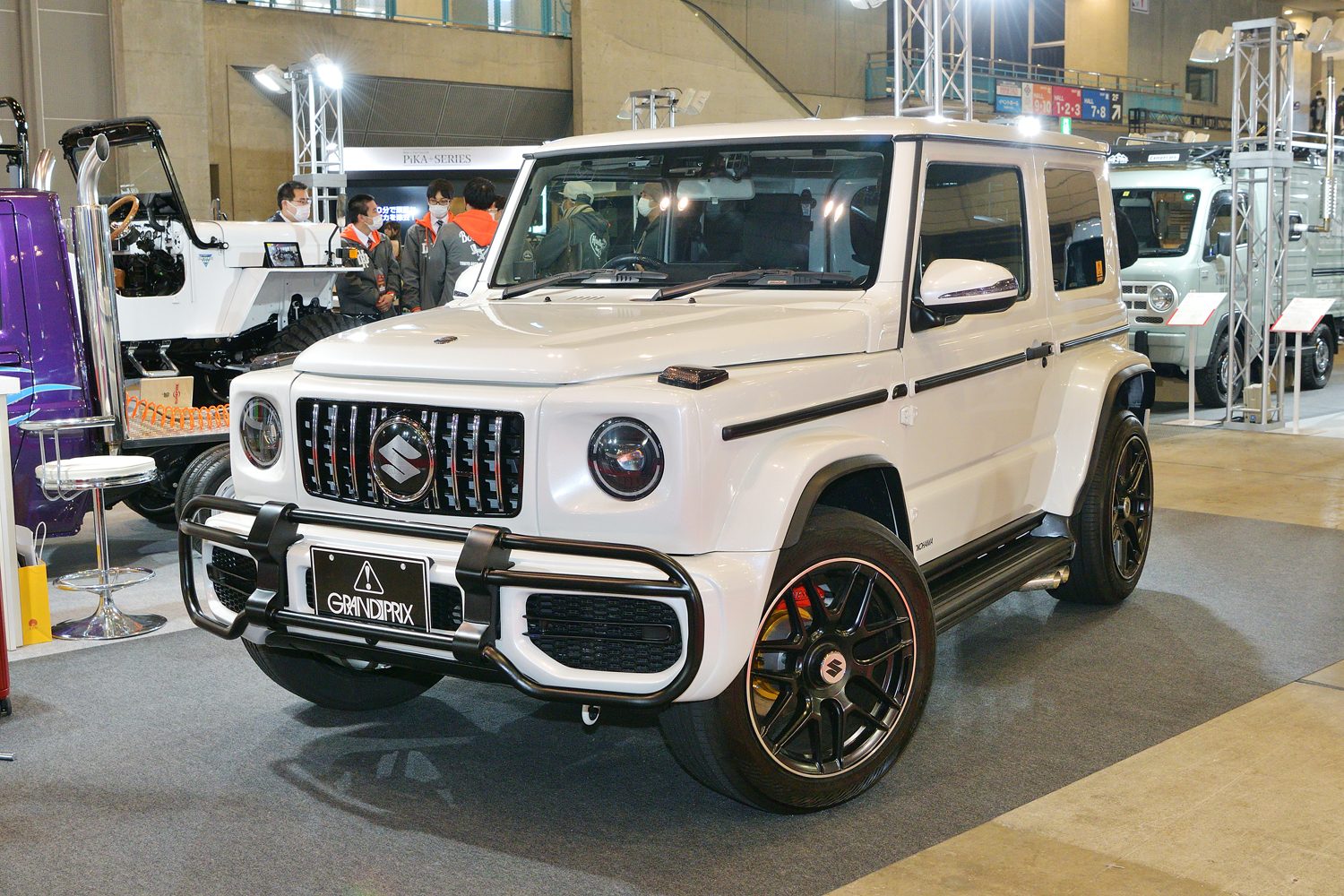 Gクラス顔”のスズキ「ジムニーシエラ」登場! 精悍カクカクボディ&オバフェン仕様がカッコイイ! 小さな「ゲレンデ風カスタムカー」が「FIELDSTYLEJAPAN」で展示! くるまのニュース。