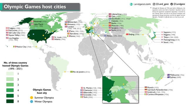 1896年以降の近代オリンピック開催都市をすべて示した地図 : r MapPorn。