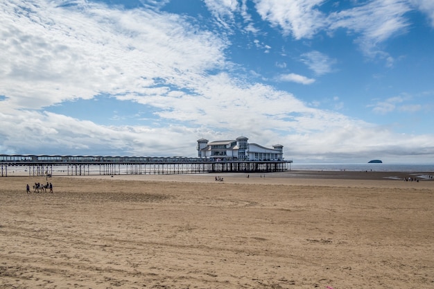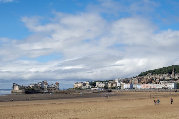 ウェストンスーパーメア、デボン、イギリス-8月18日:2021年8月18日、ウェストンスーパーメア、デボンの海岸の眺め。正体不明の人々Premium写真。