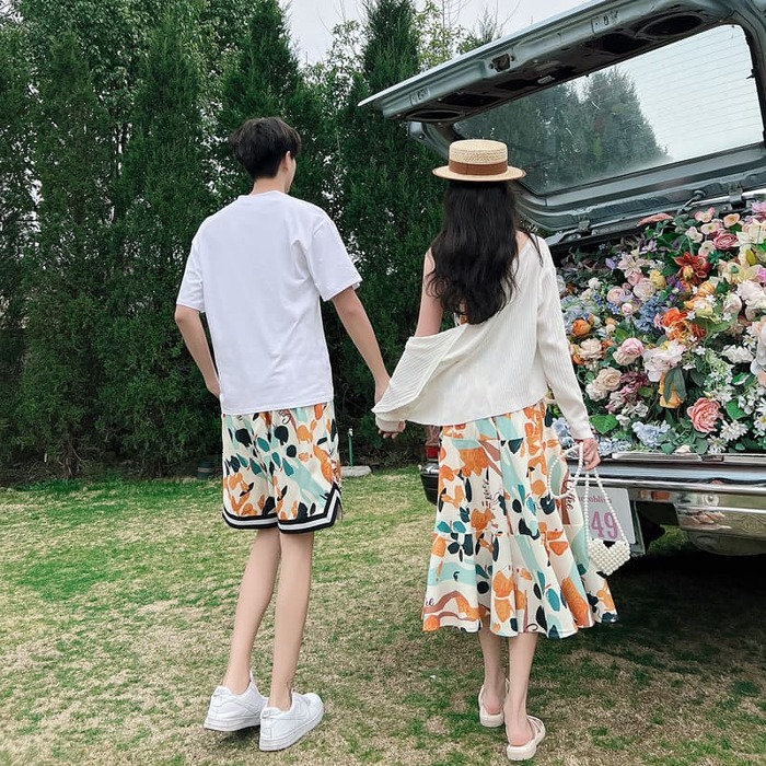 夏のカップル ビーチウェア海辺旅行 ボヘミアデザインワンピース メンズTシャツ ショートパンツ。