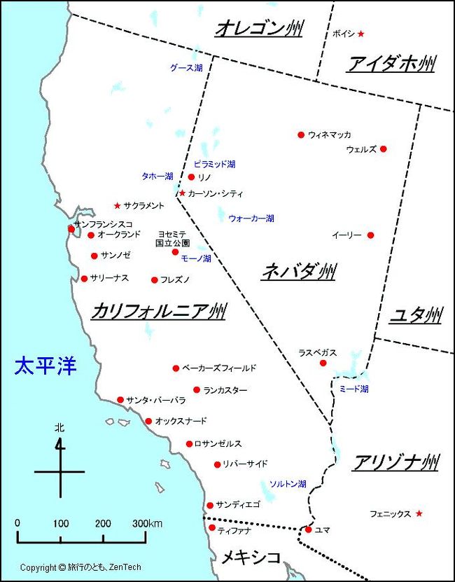 アメリカ合衆国:カリフォルニア州と周辺の州の地図 - 旅行のとも、ZenTech。