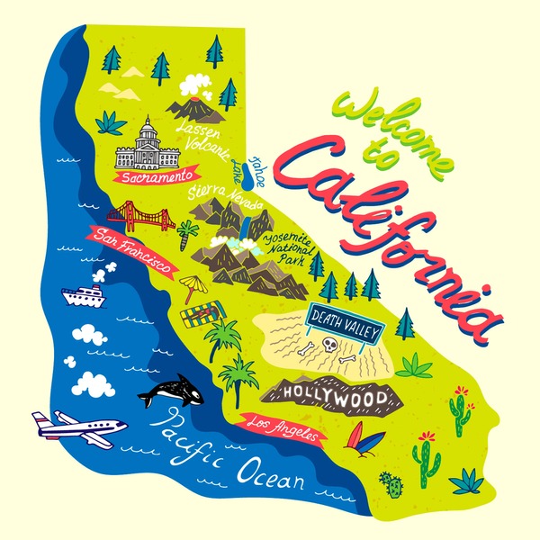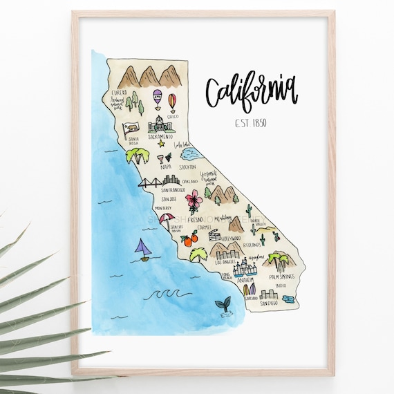 カリフォルニア州のイラスト入り州地図+送料無料、カリフォルニアプライド、カリフォルニアイラスト、カリ、カリフォルニア水彩画、水彩画カリフォルニア -Etsy 日本。