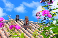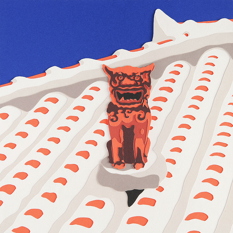 風景イラスト 切り絵、夏・沖縄の民家の屋根とシーサ。
