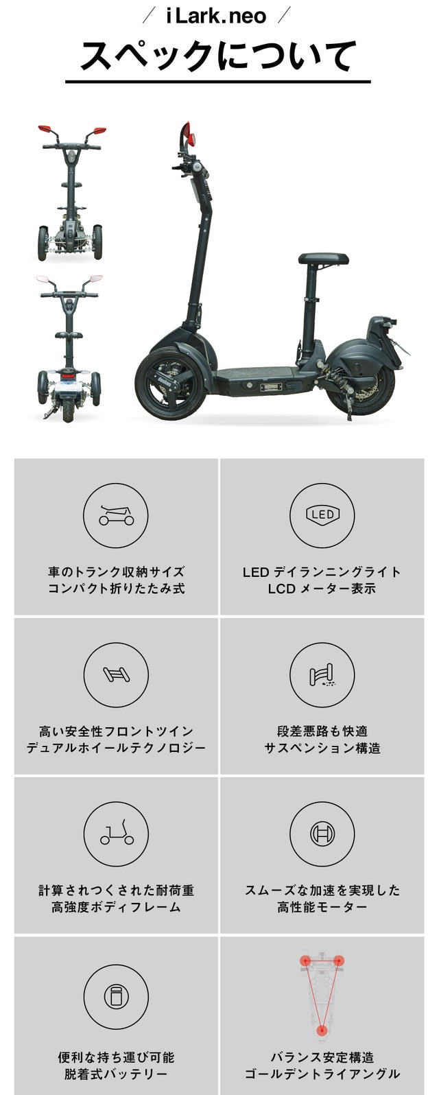 安定感が抜群!ヘルメット不要の折り畳み式三輪電動ミニカー「iLark.neo」。