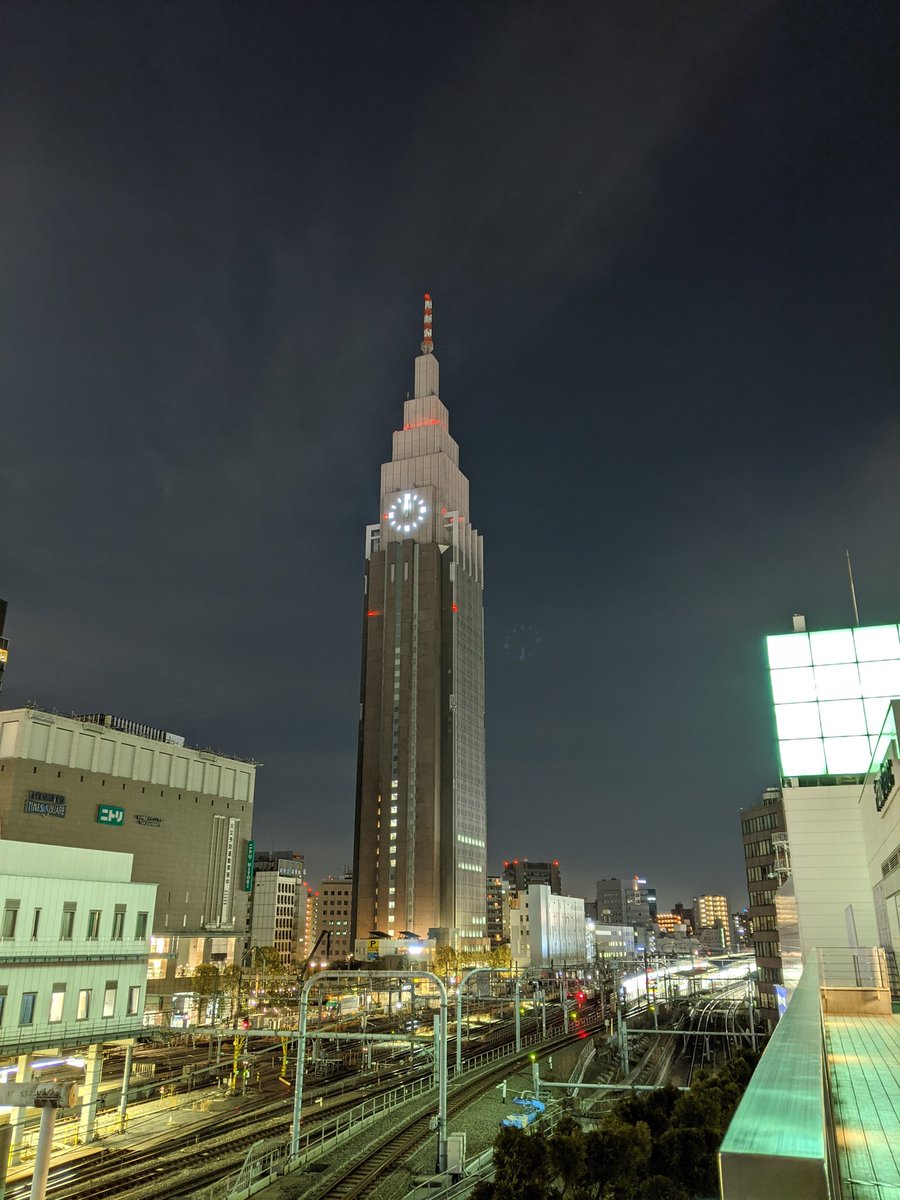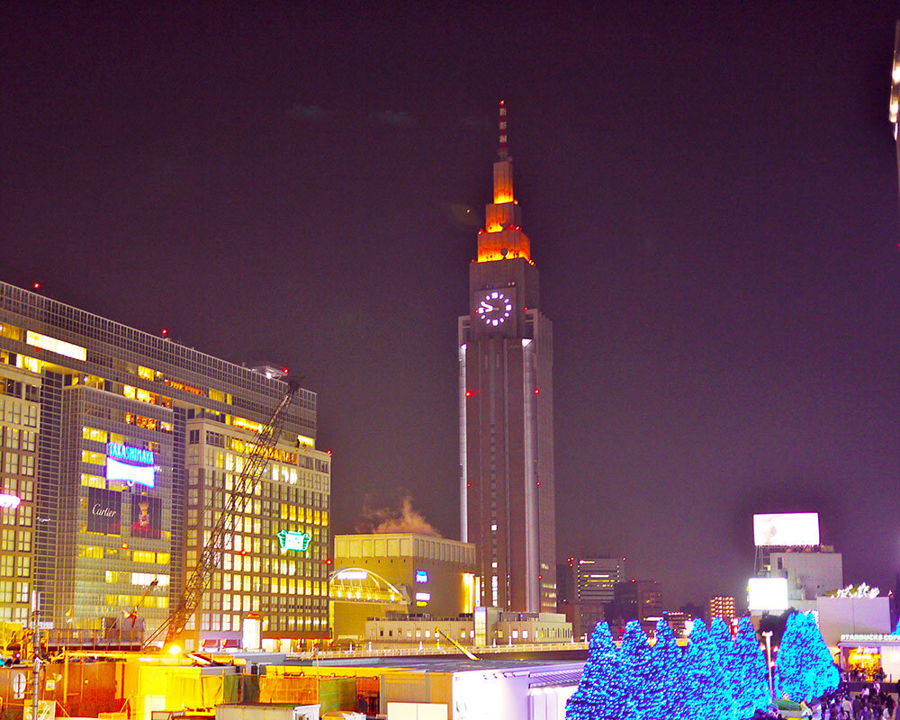 NTTドコモ代々木ビル 通称 ドコモタワー とタカシマヤタイムズスクエア。結論的にこの2つは昼間の外観の方が圧倒的に美しい。新宿ビル 群の夜景を遠方から撮るとどうしてもドコモタワーの色合いがきれいに写らず、ほなら、どんなもんか近くで見たろと思て行ったけど、夜景。