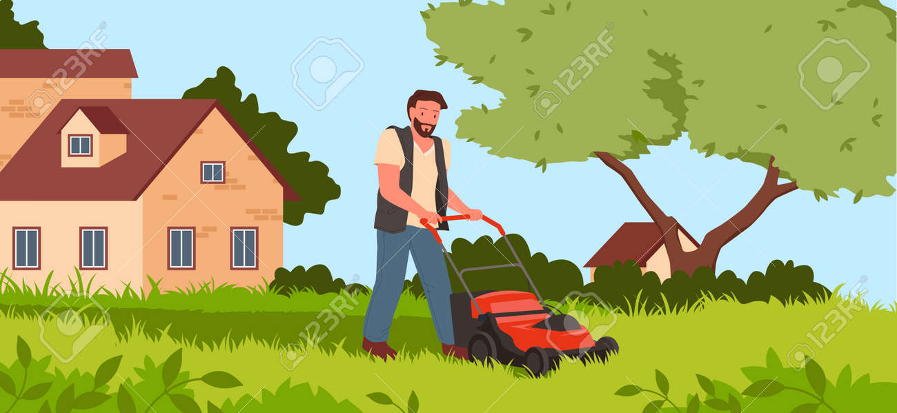 芝刈り機で庭の芝生を刈る男。ガーデニング活動、屋外農業、草刈りサービス、庭師の仕事、芝刈り機の実行、手推進機のベクターイラストのイラスト素材・ベクターImage 190024515。