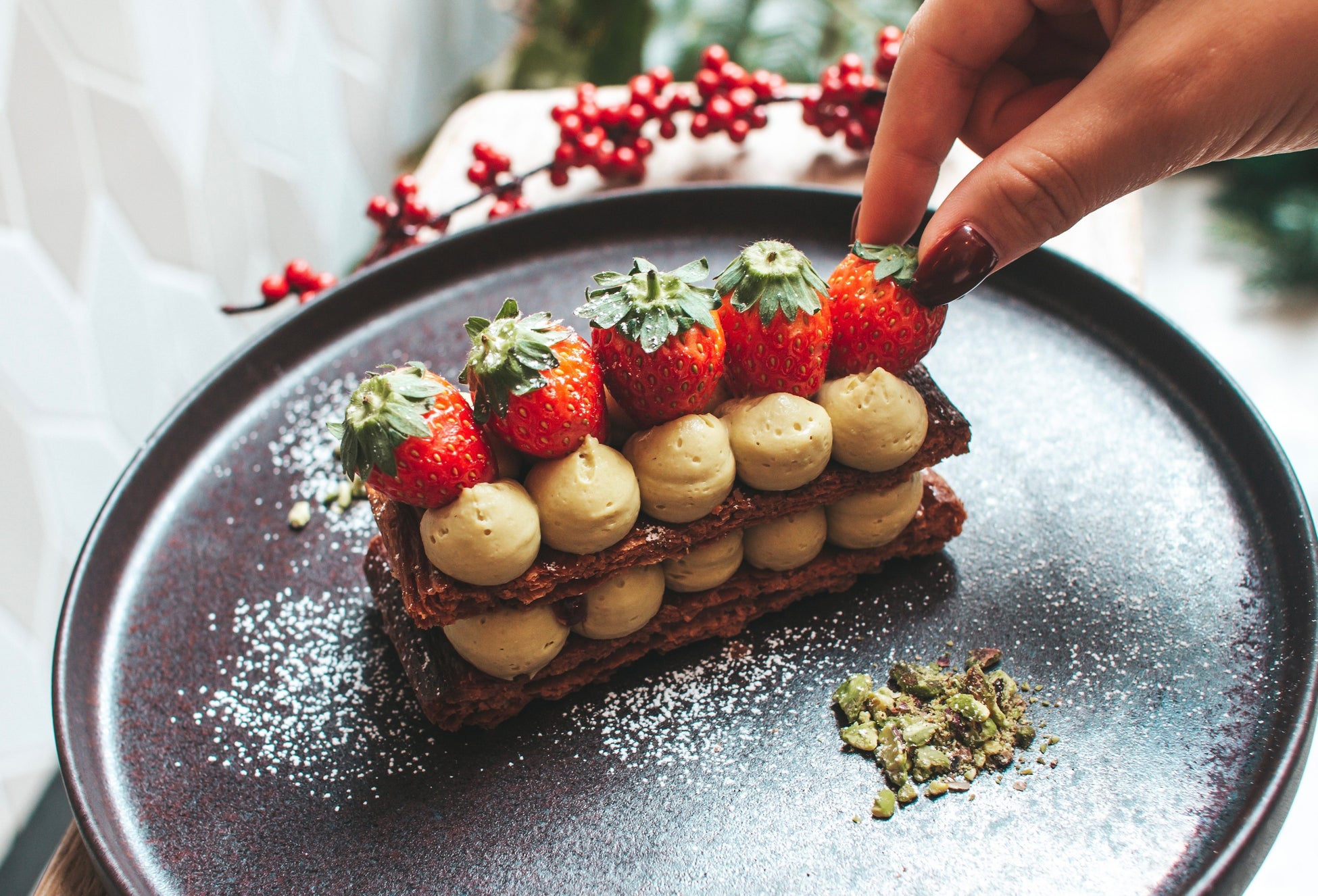 代々木公園のレストランTREE by NAKED、イチゴ×ピスタチオの限定ミルフィーユやヴィーガン仕様の冬限定新スイーツ&ホットドリンク株式会社ネイキッドのプレスリリース。