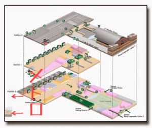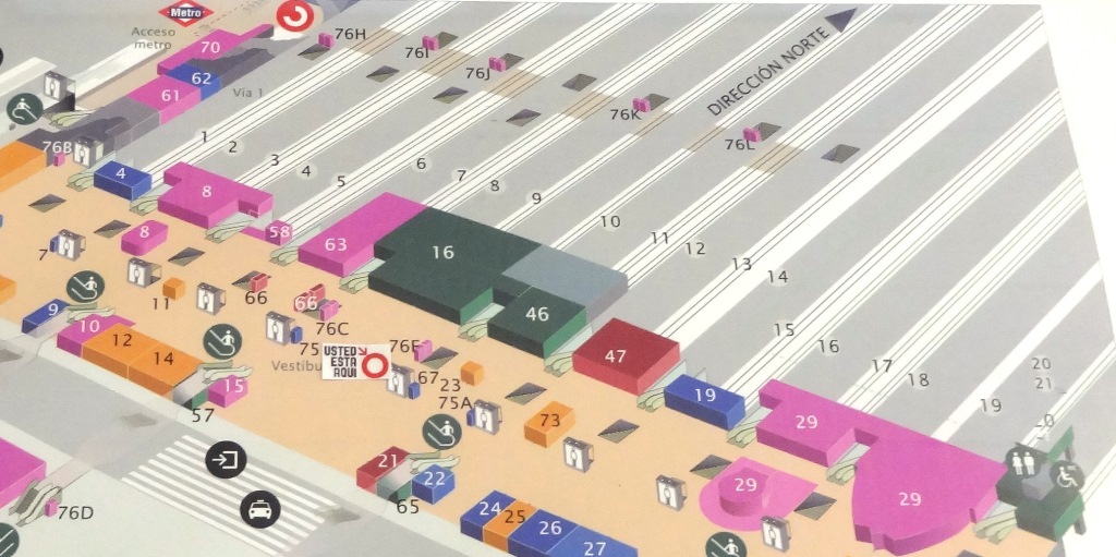 マドリード・アトーチャ駅の解説書、新幹線乗り場やメトロとの連絡口、空港行きエクスプレスバスの乗り場を図解入りで説明。