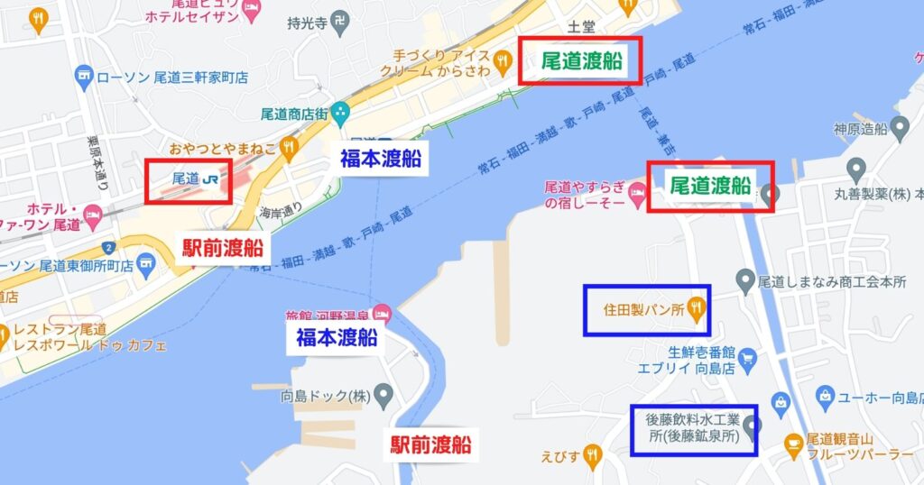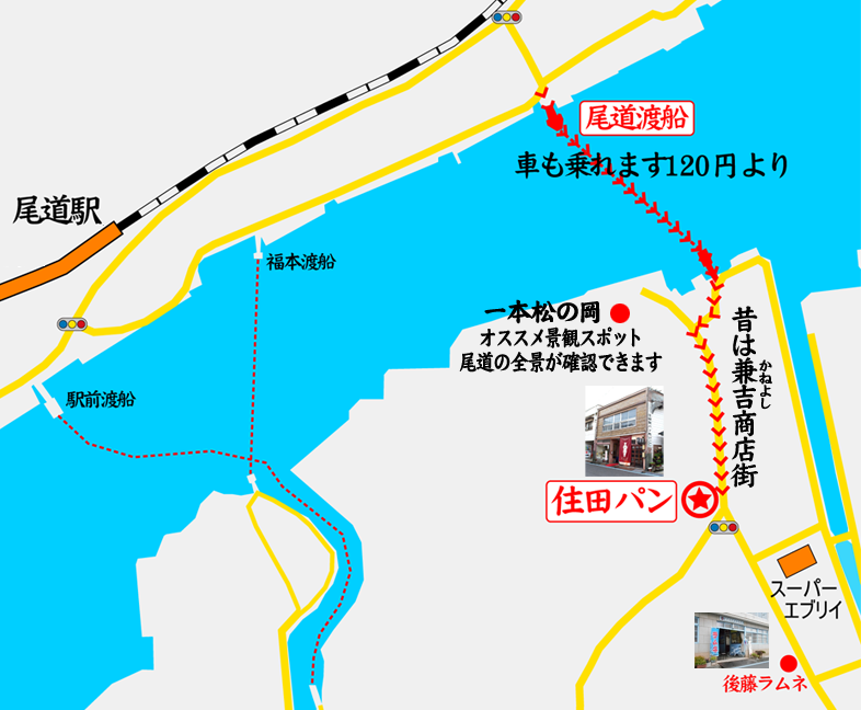 住田パン アクセスマップ 尾道・向島フェリーマップ。