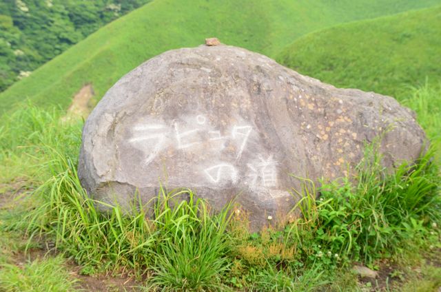 阿蘇を渡るミルクロードを走ると、何にもないところに、車が停まっている。 そこは、ラピュタの道への入り口です。現在車両通行止めにはなっているが、歩いて五分程で絶景が見える場所までつながる人道が – Foto。