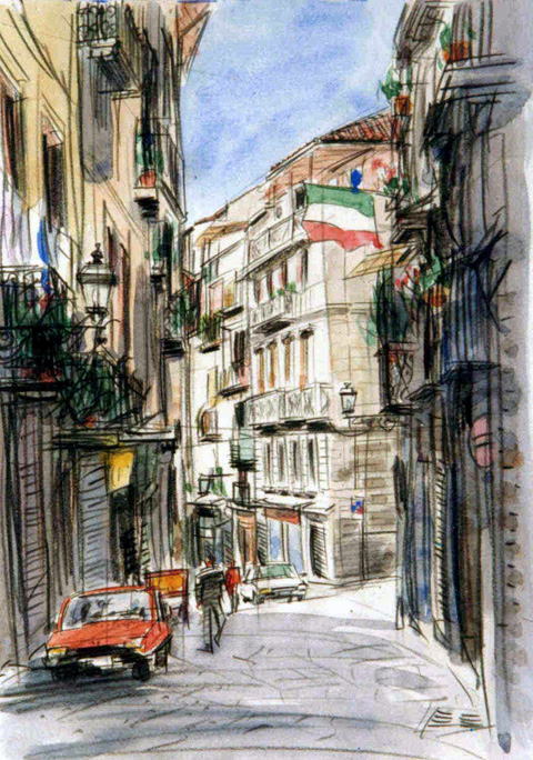 ヨーロッパの街並みスケッチ-南イタリアの街並み 2。