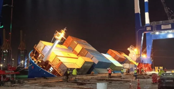 速報!港でコンテナ船が転覆!大量のコンテナが水中に落下! - シーウェイ - ニュース。