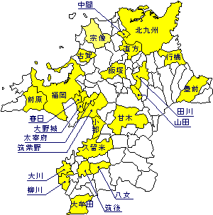 福岡県の白地図イラスト無料素材集県庁所在地・市区町村名あり。