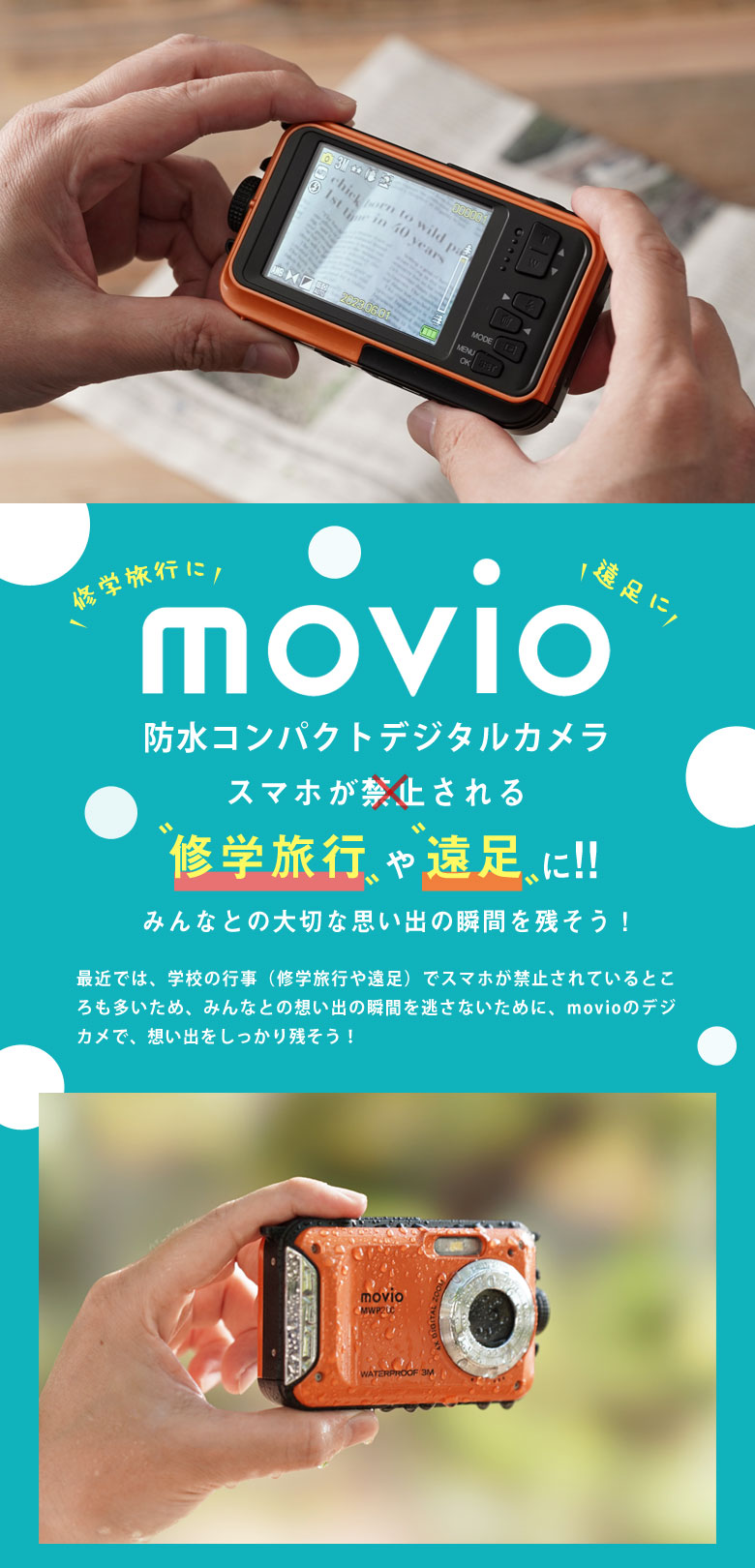 スマホが禁止される修学旅行や遠足、シュノーケリングや川、登山などのレジャーで大活躍!防水等級IPX8 movio 防水コンパクトデジタルカメラナガオカ。
