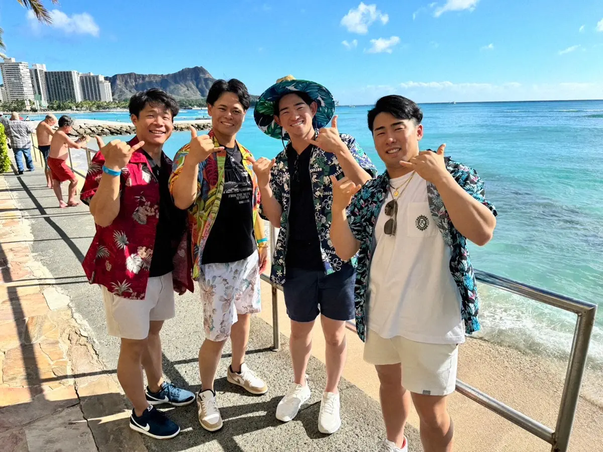 優勝旅行先のハワイで購入したアロハシャツを着てアロハポーズを決める 左から 巨人・佐々木、中山、萩尾、浅野 -。