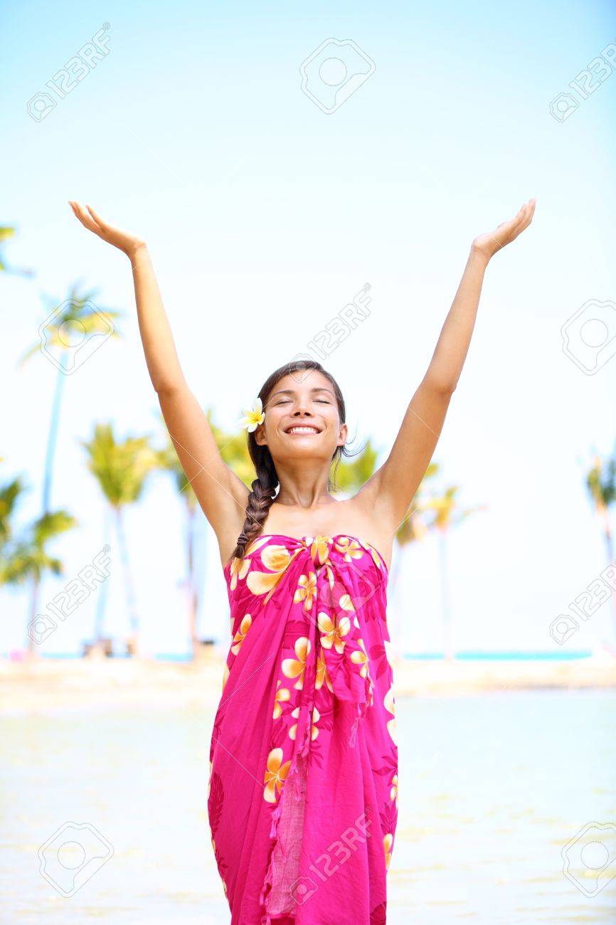 ハワイのビーチで瞑想自由無料精神的な少女ポーズ穏やかで幸せなはサロングの多文化の混合レース アジア白人の女の子を探して笑って楽しんでハワイのビーチの写真素材・画像素材Image 17924492。