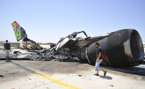 カダフィ支持派のロケット攻撃で炎上した旅客機の残骸:リビア動乱 写真特集:時事ドットコム。