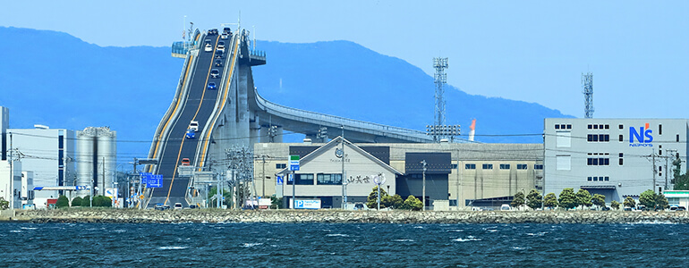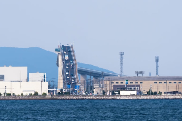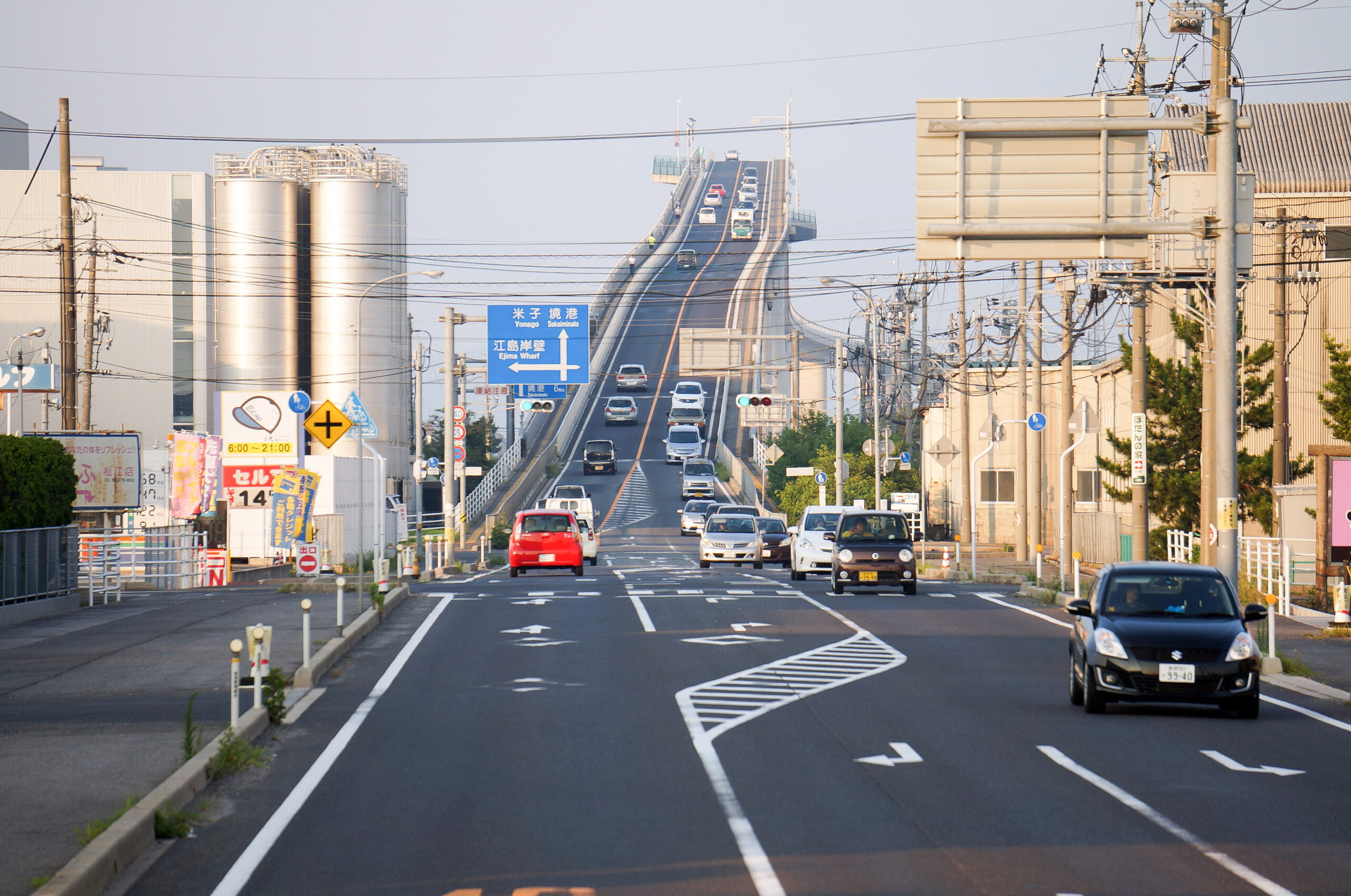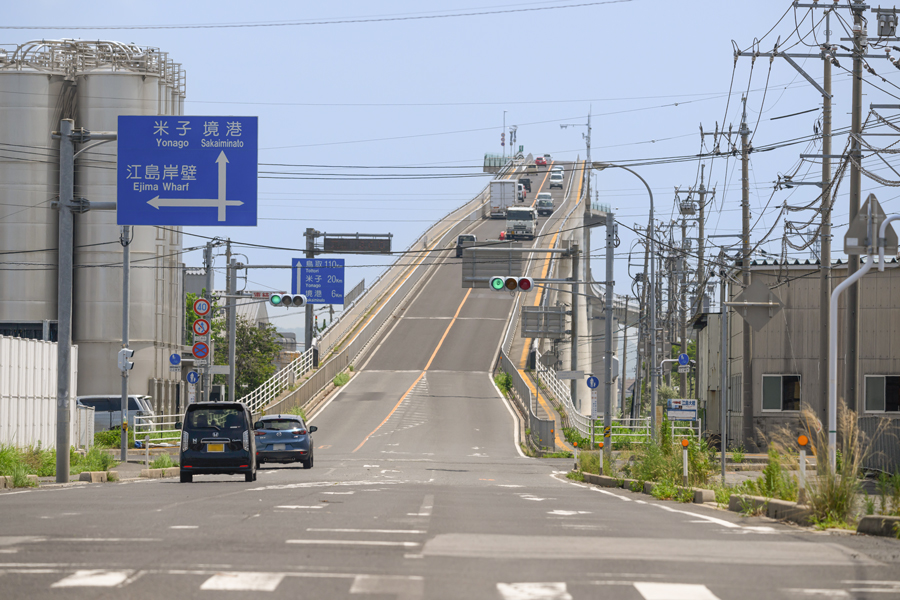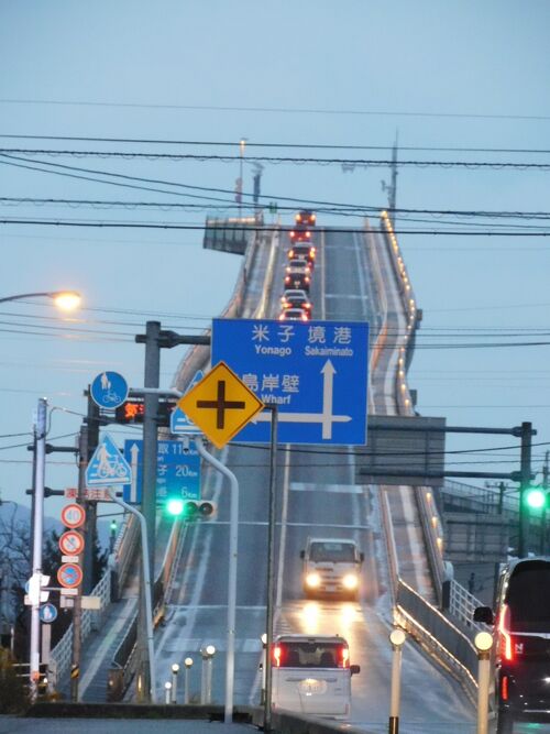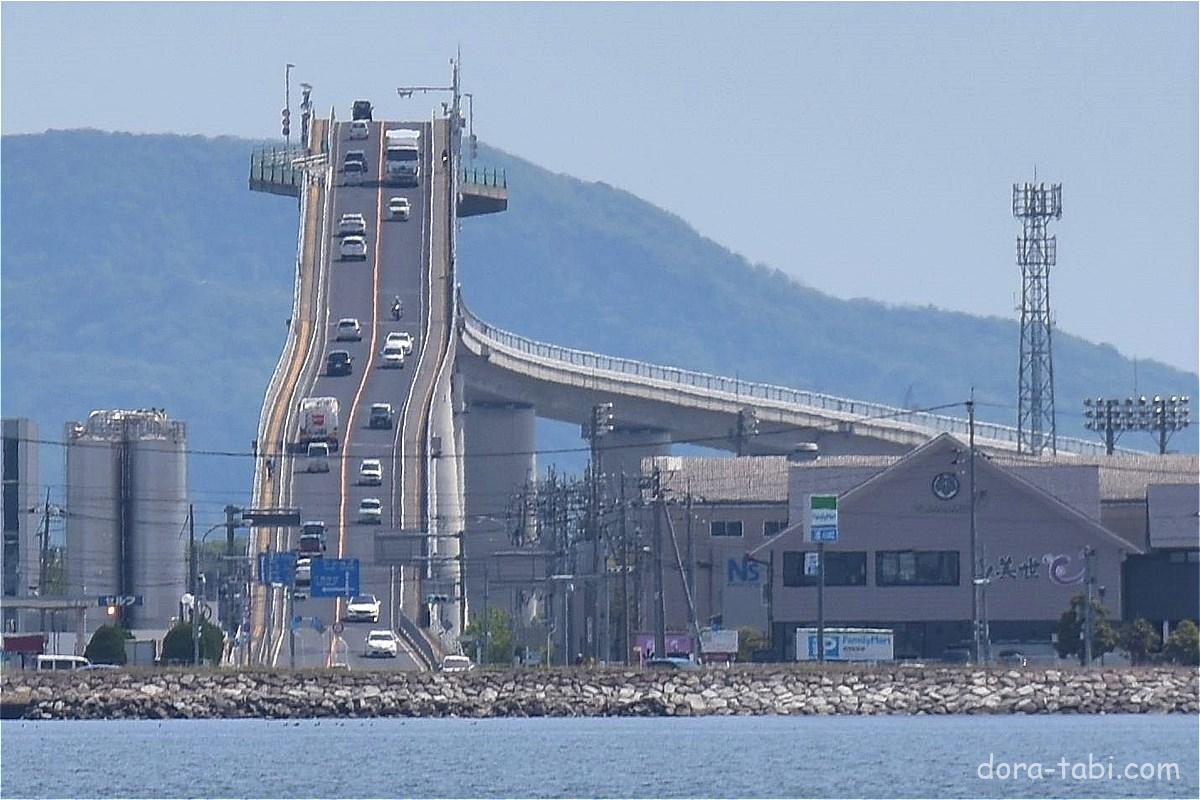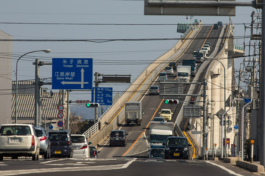橋なのに壁みたい⁉「ベタ踏み坂」, 大根島のお隣に浮かぶ江島と, 鳥取県境港市を結ぶ「江島大橋」, ベストフォトスポットはどこ?,急こう配の写真撮影をするなら,。