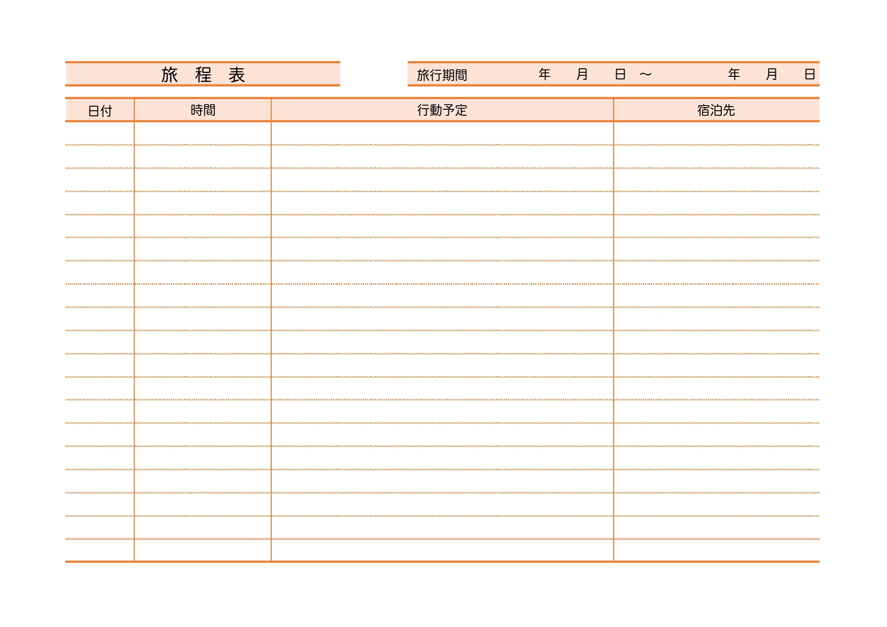 シンプルな旅行行程表のテンプレート・日程や宿泊先などの項目を記入するだけの簡易的なフォーマット Excel・Word・PDF可愛いだらけ。
