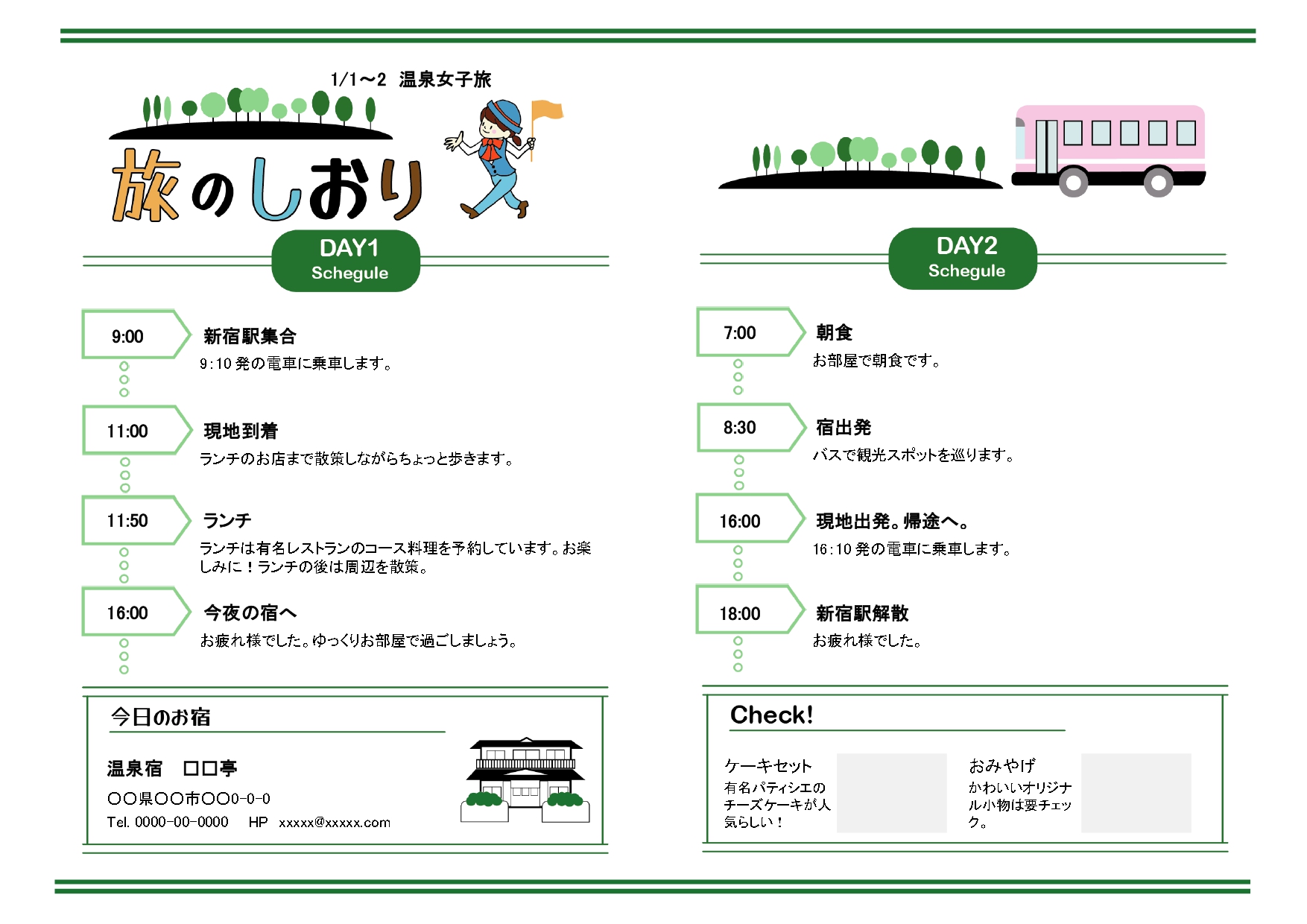 作成簡単!日帰り旅行工程表「エクセル・ワード・PDF」💗無料ダウンロード「かわいい」雛形・テンプレート素材。