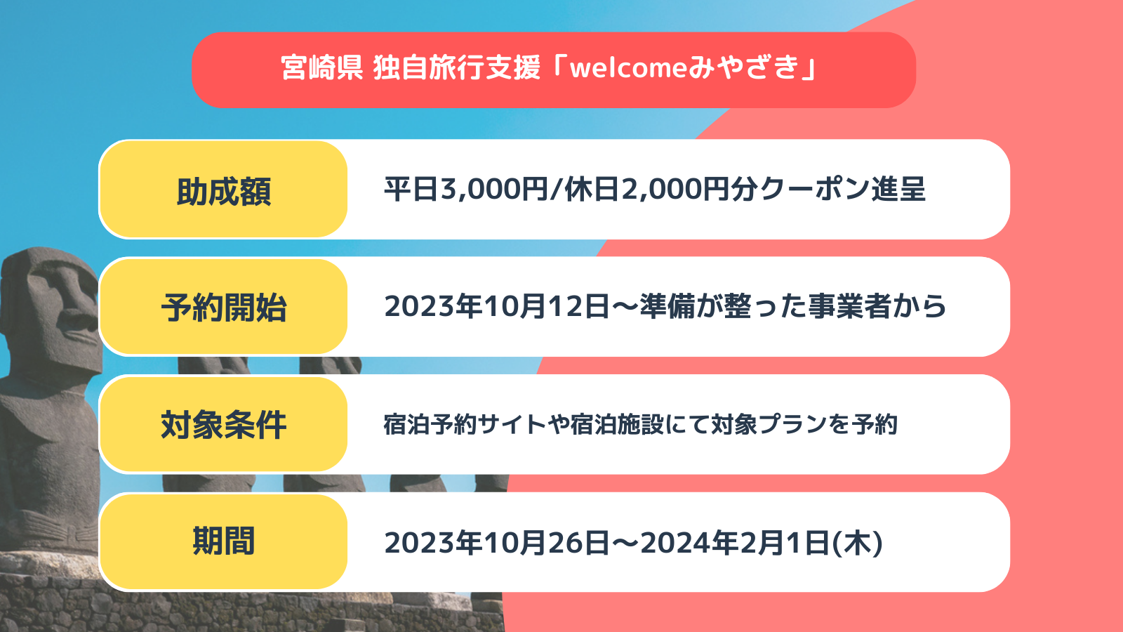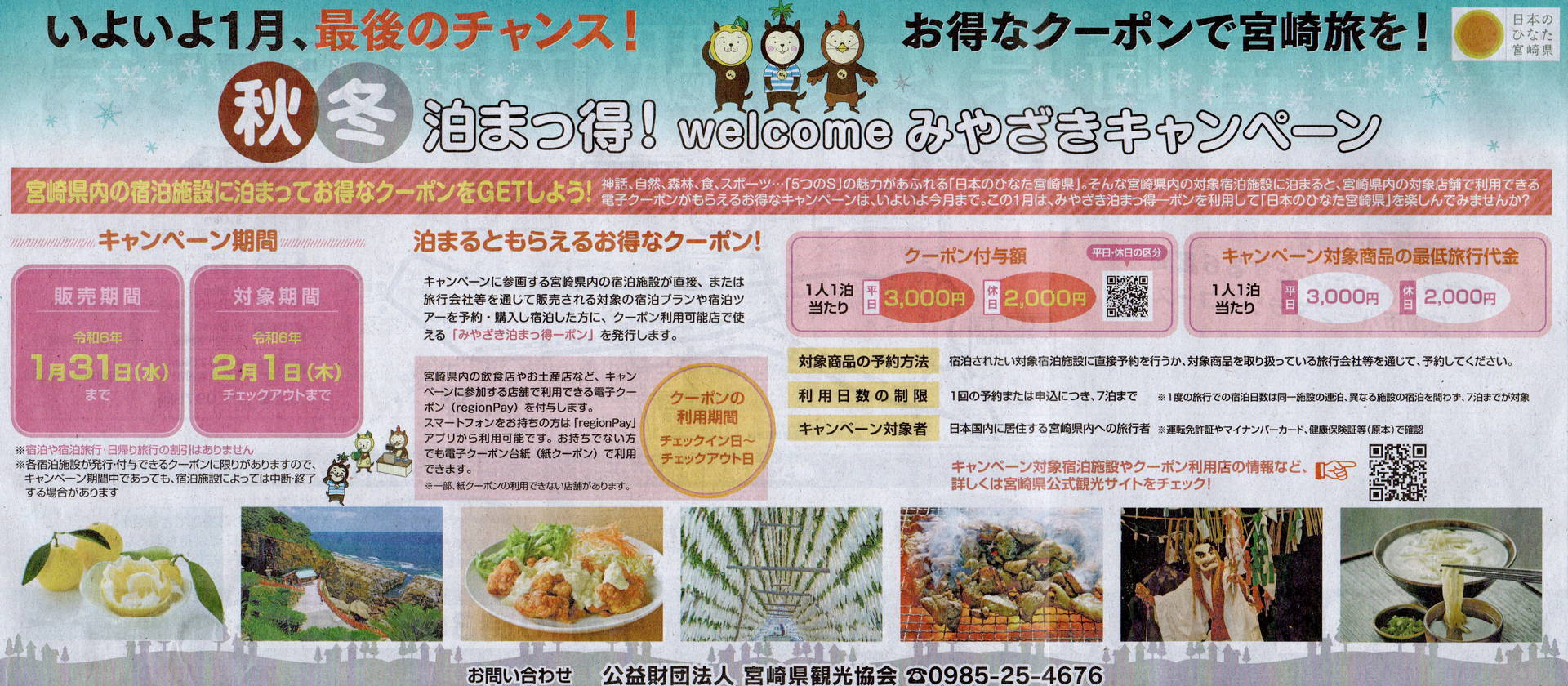 秋冬泊まっ得!welcomeみやざきキャンペーン」2024年1月末まで 最大3千円分の宮崎旅行支援ホテル・旅行クーポンメディア Airstair。