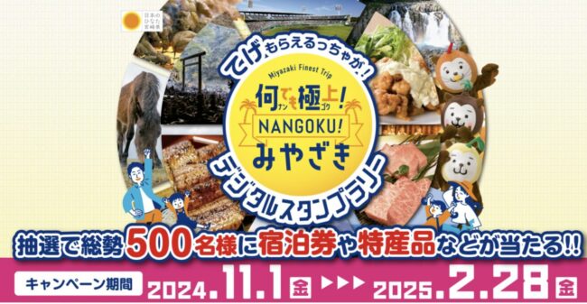 宮崎県の旅行割引「何でも極上!NANGOKUみやざき」クーポン配布やスタンプラリーを実施する旅行支援。